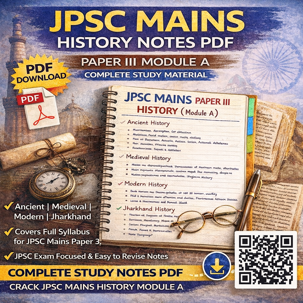 Prepare smartly for JPSC Mains History with these structured, syllabus-based notes specially designed for Paper III – Module A (History). These notes simplify complex topics and provide crisp coverage for quick understanding and last-minute revision.