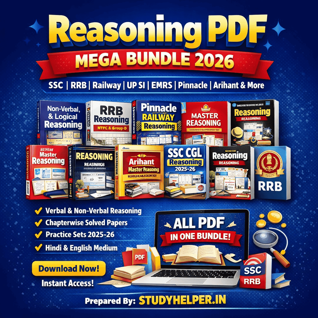 यह Reasoning PDF Mega Bundle 2026 सभी प्रतियोगी परीक्षाओं के लिए एक complete preparation package है। इसमें आपको Verbal, Non-Verbal, Logical Reasoning + Chapterwise Solved Papers + Practice Sets मिलेंगे, जिससे आपकी reasoning strong होगी।