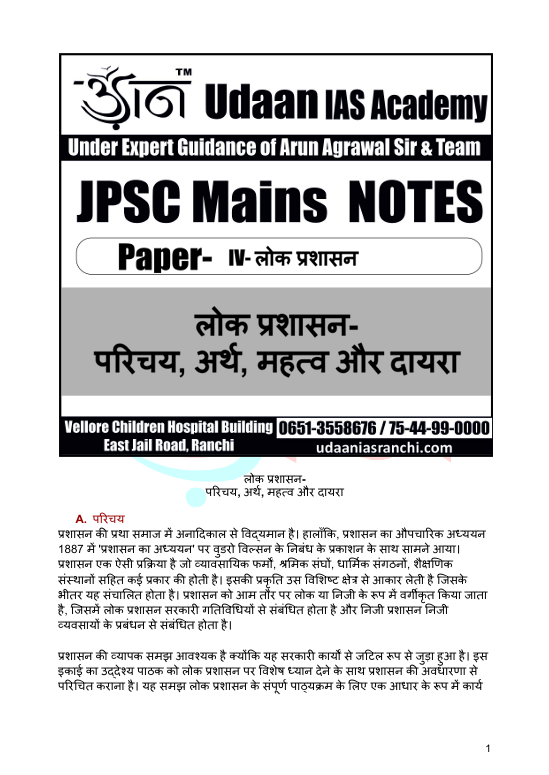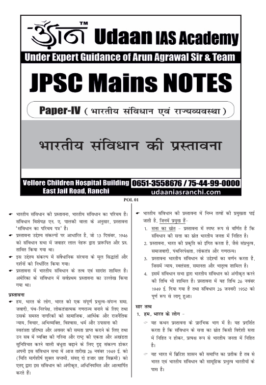 Udaan JPSC Mains Complete Study Notes (Hindi) – History, Polity, Geography, Eco, Science & Public Administration